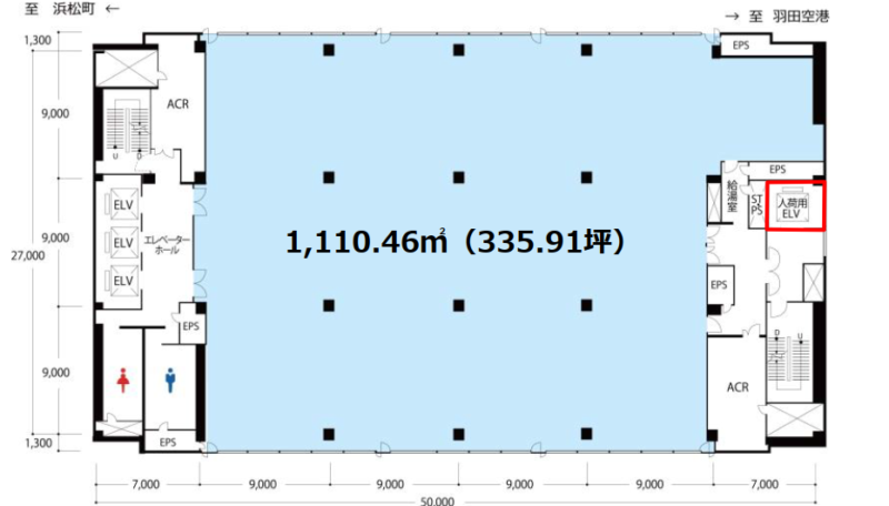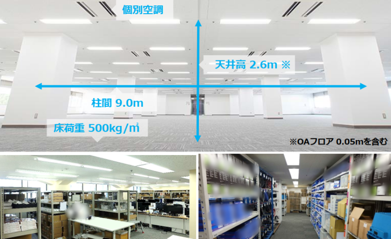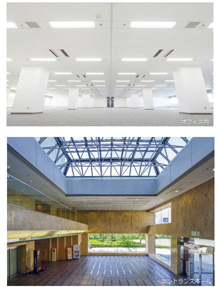 | 設備・条件 その他 | EV:乗用3台、貨物兼用1台(カゴ寸法:横2mx奥行2mx間口1.7m、ハンドフォーク不可) 個別空調有 床荷重:標準500kg/㎡ 天井高:2.6m 24時間有人管理(夜間通用口も含め24時間365日入退館可能) 床仕様:タイルカーペット コンセント容量:50VA/㎡(増設対応可能) 照明器具(専有部):LED 各階男女別トイレ有 給湯室有 主要なサービス施設:カフェ、飲食店、コンビニ、郵便局、喫煙室、休憩室等 新耐震気分に基づく建築物 |